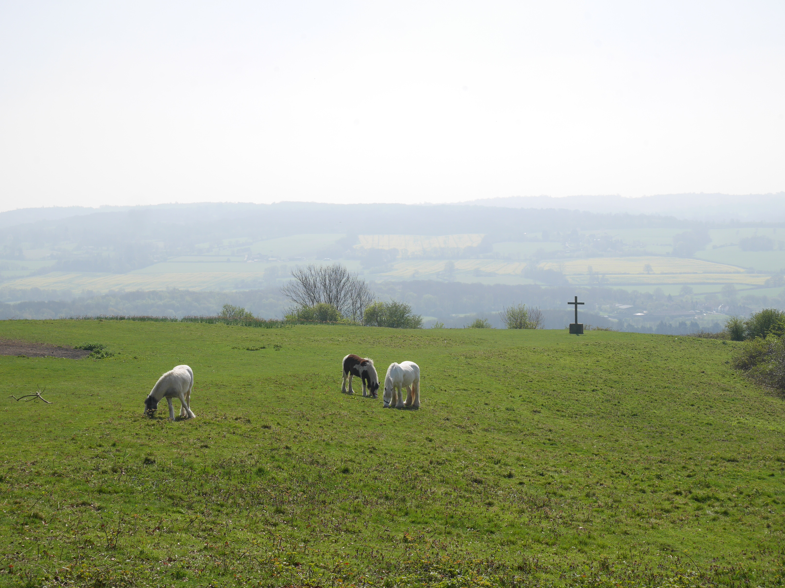 Next we walked along the edge of another bluebell wood and down some steps to our first amazing view of the day! This was the start of Kemsing Down Nature Reserve. The grass was covered in bunches of yellow primroses, and had views out to the Kentish countryside. While we were there, the views were gorgeous, if a little hazy. We walked along this ridge to emerge at a viewpoint overlooking the village of Kemsing. There are some happy grass-munching horses and a large cross.
